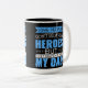 A Cute Typography Mug For Dad In A Black And Blue Combo Mug That Reads, Some People Don't Believe In Heroes But They Haven't Met My Dad.