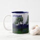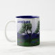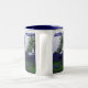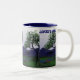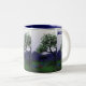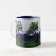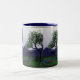 Mugre personalizada con montañas, árboles y un zorro bajando al río para tomar algo. Azul y verde.