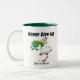 Graciosa taza de café con una nota positiva. Nunca se rinda con una cigüeña tragando a una rana que tiene las manos alrededor del cuello de las cigüeñas. Divertido regalo e inspiración para amigos y familiares.