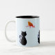 Gato negro y pájaro rojo en la taza de fondo azul claro.