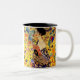 Coffee Mug con la pintura al óleo de Gustav Klimt Lady with Fan (1918). Una mujer con un kimono azul sostiene un ventilador rojo contra un colorido fondo amarillo de flores y pavos reales. Un gran regalo para los amantes del arte japonés y europeo.
