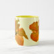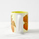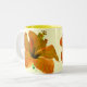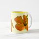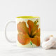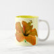Un hibisco bonito del naranja y del amarillo florece en sol tropical en esta taza de café.