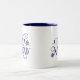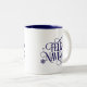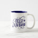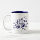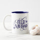 This ceramic coffee mug is shown in a festive holiday Feliz Navidad snowflakes print.