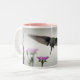 Las flores y un colibrí se extienden alrededor de una taza de dos tonos.