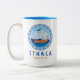 Taza de café de dos tonos de Ítaca, Grecia con un diseño de un barco griego antiguo y letras de estilo griego. Este diseño de barco de la antigua Grecia tiene la llave griega en un diseño de círculo con el mar y el cielo. Este diseño de estilo griego hace que esta taza sea un regalo ideal o un recuerdo o para beber café mientras está de vacaciones en la isla de Ítaca.
