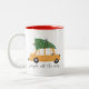 Este diseño muestra un auto amarillo que lleva un árbol de Navidad atado a su techo, rodeado de copos de nieve cayendo. El coche tiene manchas de nieve sobre él, lo que añade a la acogedora atmósfera de invierno. Debajo del auto, la frase "jingle todo el camino" está escrita a mano y juguetona.