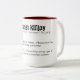Taza de café personalizada de 444ml. ¡En cuanto a tamaño sólo puedo decir que enorme! pero es lo que esperaba así que estupendo. En el asa me entra la mano entera y no sólo tres dedos como me ocurría con las otras tazas. También comentar que es el tamaño que se ve en las series americanas, tanto para café como para infusión. En cuanto al acabado decir que es correcto, con poco tiempo de uso no puedo especificar mucho más. Pude escoger el nombre y el color pero no la tipografía, quizás esa elección pueda decidir a más gente. En términos generales y por el momento, buena opinión.