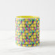 Esta taza tiene un diseño moderno de mediados de siglo de luna creciente dividida horizontalmente en tres colores, rosa, azul, lavanda o marinero, dividido en dos y esparcido en una rejilla de fondo amarillo. Si te gusta el diseño pero quieres colores diferentes, envíame un mensaje.