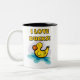 Un pato amarillo que camina sobre el agua azul con un texto que dice Me encantan los patos con camisetas de pato, caramelos, tazas, bolsas, tarjetas, imanes, aguijones, mousepads, pegatinas, almohadas, cadenas de llaves y muchas otras prendas de pato y artículos de regalo.