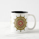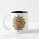 Este diseño de círculo concéntrico dorado y rosado se inspiró en los métodos indios y los disfraces de anime japonés. Cuenta con capas con pétalos de loto, hojas, paisajes y una rueda ornamental alrededor de todo. Hay otros colores y estilos de taza disponibles, incluyendo tazas de viaje y steins.