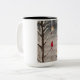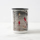 Disfrute de su café o té en esta hermosa taza con una familia de cardenales en invierno. El original, titulado "Árbol de familia" fue pintado por el artista David Pepper en 2022.