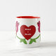 Mug con un lindo par de pájaros rojos con acentos cardíacos y texto a personalizar con nombres escogidos u otro mensaje. Dulce diseño para recién casados, San Valentín o el Día más dulce.