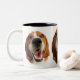 Esta alegre taza muestra la cara sonriente de Peaches el perro sabueso.