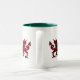 Coffee Mug con motivo de Navidades de temporada que presenta Dragon (Dragon Cymru Dragon - Wales) trenzado de búfalo rojo y negro y árboles de Navidad decorados con coloridas estrellas.