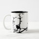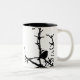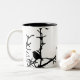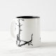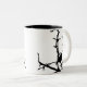 Este tazón contemporáneo de arte fino presenta una silueta en blanco y negro, un patrón abstracto moderno de un Junco de ojos oscuros (Junco hyemalis) encaramado en una rama desnuda en lo alto de un árbol. Este pájaro es en realidad una especie de gorrión pequeño, gris y blanco. El diseño se repite en los lados derecho e izquierdo.