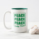 Peace Peace Peace Pretty Please Two-Tone Coffee Mug. This typography design layers “peace” in bold repetition, building importance, while a gentle “pretty please” in script softens the tone, a heartfelt, visual for harmony and understanding.