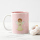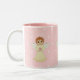 Hermosa taza con tres dulces ángeles pequeños con estampado estrella en fondo rosado.