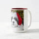 Una fotografía de la raza del perro de Shih Tzu que lleva un gorra de Santa, poniendo delante del árbol de navidad durante las vacaciones para saludar Felices Navidad.