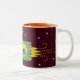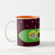 Taza linda para los niños. Una nave verde del cohete con dos perros y un gato dentro del vuelo a través de un cielo estrellado con una luna creciente. Diseño del vector en verde y marrón.