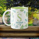 Personalized garden theme coffee mug in a pretty, blue and green watercolor floral design.
