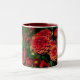 Magníficas dahlias rojas profundas con un fondo oscuro en esta asombrosa jarra.