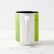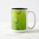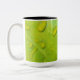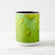 Esta taza presenta una fotografía abstracta original de ZoeSPEAK de gotas de lluvia en una hoja. En la foto de cierre, vemos la textura y las venas de la hoja magnificadas en los contornos de las gotas de agua. La brillante hoja verde amarilla refleja el azul y el amarillo del cielo y la luz del sol.