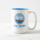 Santorini, Grecia, tazón de café de dos tonos con un diseño de un antiguo barco griego y letras de estilo griego. El diseño de este antiguo barco griego tiene la llave griega en un diseño circular con el mar y el cielo. Este diseño de estilo griego convierte a esta taza en un regalo o recuerdo ideal para tomar un café durante sus vacaciones en la isla de Santorini.