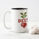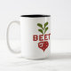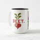 Un divertido diseño de tazas con el texto "Just Beet It" en una fuente multicolor, que recuerda a un estilo de vida saludable y energético. El texto se centra en la taza, con un pequeño ilustracion de remolacha en la esquina, una pequeña hoja y un corazón pequeño, todo ello en un estilo lúdico y multicolor.