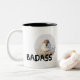 Foto de un pequeño pero más bien agresivamente mirándote gorrión y un texto Badass. Esto es realmente problemático. Curiosa taza de café para cualquiera