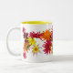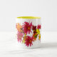 Relájese con esta alegre taza que presenta un diseño colorido de dahlias brillantes en colores brillantes de rosa, amarillo, naranja, oro, fuschia y marrón sobre un fondo blanco puro. Hay más dahlias dispersas en el interior. Se llaman estrellas porque, a diferencia de los dahlia tradicionales, los pétalos tienen una forma de estrella puntiaguda.