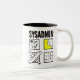 Texto de Sysadmin y un dibujo de cuatro ventanas. Uno con un vaso roto, otro con un abordaje. Sysadmin lanza sospechosamente desde detrás de la cortina de una ventana luminosa. Por diversión y buen humor. Café De Dos Tonos. ¡Personalizable. Puede cambiar la imagen.