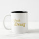 El "Utah Strong" de café de dos tonos representa el epitomima de las tendencias contemporáneas del diseño mientras se celebra la resiliencia y el espíritu de Utah. Diseñado con gran interés para la estética moderna, esta taza combina perfectamente la elegancia minimalista con mensajes impactantes. En la parte delantera de la taza aparece la tipografía audaz y elegante, que explica "Utah Strong" con letras doradas llamativas. El uso de acentos dorados añade un toque de lujo y prestigio, elevando el atractivo visual de la taza y haciendo una declaración poderosa. La elección del tipo de letra refleja sensibilidades de diseño modernas, con caracteres sans-serif elegantes que transmiten un sentido de fortaleza y resiliencia.