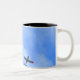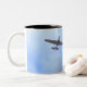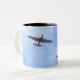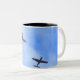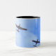 A coffee mug featuring a photo of two war planes in formation.