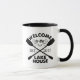 Se apaga el fin de semana con esta taza personalizada. El diseño presenta "Bienvenidos a la Casa del Lago" en una tipografía rústica negra con un ilustracion de cuerda y dos remos cruzados. Personalizar del año en que empezaste tu vida en el lago! Excelente regalo para los nuevos propietarios o anfitriones de escapadas de fin de semana.