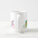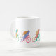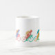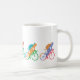 Raza colorida de cinco ciclistas alrededor de una taza de café.