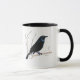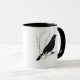 Esta es una taza de Personalizable con un dibujo de un pájaro negro hecho a lápiz de color y un verso inspirador.