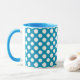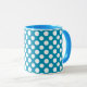 Un tazón de café de moda blanca y cerámica con un labio azul y mango y blanco sobre puntos de polka jumbo azul. Puede cambiar el color de fondo (blanco) si lo desea utilizando los botones Editar > Fondo. Este patrón, que forma parte de la colección "Marigold Medley" de Posh & Painterly, se adapta a cualquier taza.