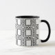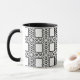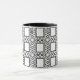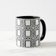 Esta taza blanco y negro elegante, decorativa ofrece un modelo abstracto adornado del curlicue que rodea cuadrados centrales.