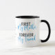 ¡Aquí hay una taza para mamá el Día de la Madre que le sacará las cuerdas del corazón! El texto en dos lados está en azul pastel suave y negro, y dice "Primero mi madre, por siempre mi amigo". El texto de su personalizado está en el centro de 4 campos fáciles de cambiar, así que también puede hacer de esto un regalo de cumpleaños. ¡Le encantará!