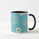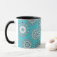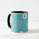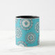 Una taza de 325 ml con mi patrón de Mandala 1 impreso en fondo azul.