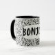 Catch the trend with this eye-catching "Bonjour" mug, blending a nostalgic pattern with a chic, modern greeting.