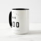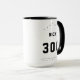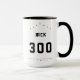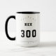 Mug de boliche personalizado con el texto de su personalizado (por ejemplo, nombre y puntuación personal alta) en un tipo de letra negrita estilo deportivo. Ejemplo de texto mostrado: Nick 300 Puede personalizar los colores de los puntos, flechas y línea defectuosa. Predeterminado: negro.