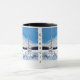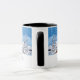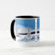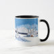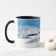 Una taza con una hermosa escena invernal que incluye montañas cubiertas de nieve, pinos y una cabaña rústica. Las imágenes y el texto se pueden personalizar, reemplazar o eliminar. Arte original de W.B.