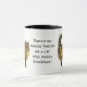 Una taza de café blanca con una llanta y mango negros y una manga de un tabú marrón de pelo largo de una pintura acuarela de Judy Adamson delantera y trasera. El texto, entre las dos imágenes, es "No hay botón de nostalgia en un gato que quiere desayunar".
