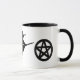 Una silueta negra de una bruja en una escoba con su gato, con un pentáculo a cada lado de ella