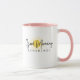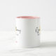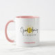 ¡Un adorable Good Morning Sunshine café mug o leche de chocolate para los niños! ¡personalizar el color de dos tonos! La taza se muestra aquí en blanco con un mango rosado. El guión del buen día del sol está en negro sobre un sol simple, brillante y amarillo. ¡Personalízalo!