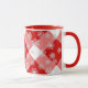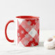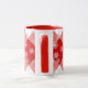 Mug en un patrón grande, profundo, rojo y blanco de manchas de búfalo, con copos de nieve blancos y flúor