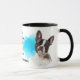 Un hermoso retrato de un Bulldog francés blanco y negro es la característica de dos lados de esta taza. Cada imagen se coloca sobre un fondo de salpicadura azul brillante. Entre las dos imágenes está el texto que describe a este compañero leal y divertido, con "el BULLDOG FRANCÉS" en negro en la parte inferior. Todo el texto es fácilmente personalizado a cualquier cosa que prefieras; ¡describe a tu propio amigo leal!