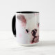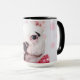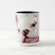 Bulldog francés, 7 meses de edad, con corbata rosada y como fondo de papel pintado blanco, con puntos rosados de polka.