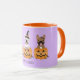 Ilustracion de tres cachorros de Bulldog franceses de diferentes colores con calabazas vestidas con atuendo de Halloween.